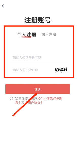 3、进入【注册账号】界面,分为个人注册和法人注册,用户可根据需求选择相应的类型进行注册。