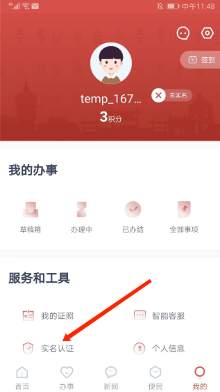 2、进入【用户中心】界面,在服务和工具栏目选择【实名认证】选项,