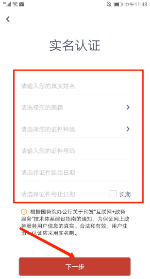 3、进入【实名认证】界面,填写完相关信息后选择【下一步】即可完成实名认证。