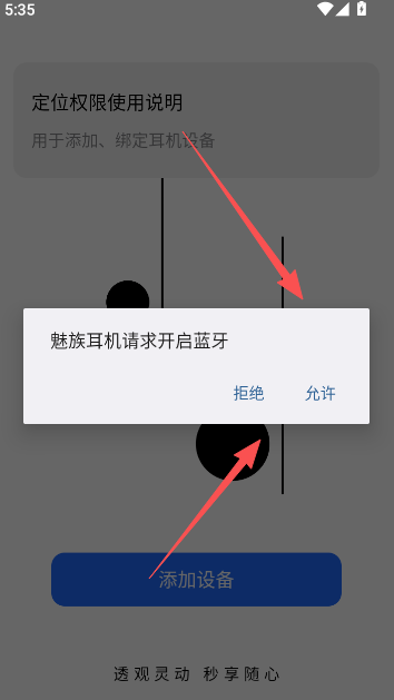 2、允许应用获取定位权限,通过使用开启蓝牙的方式完成耳机配对。