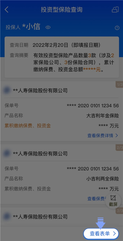 2、查看需要填报的投资型保险情况。