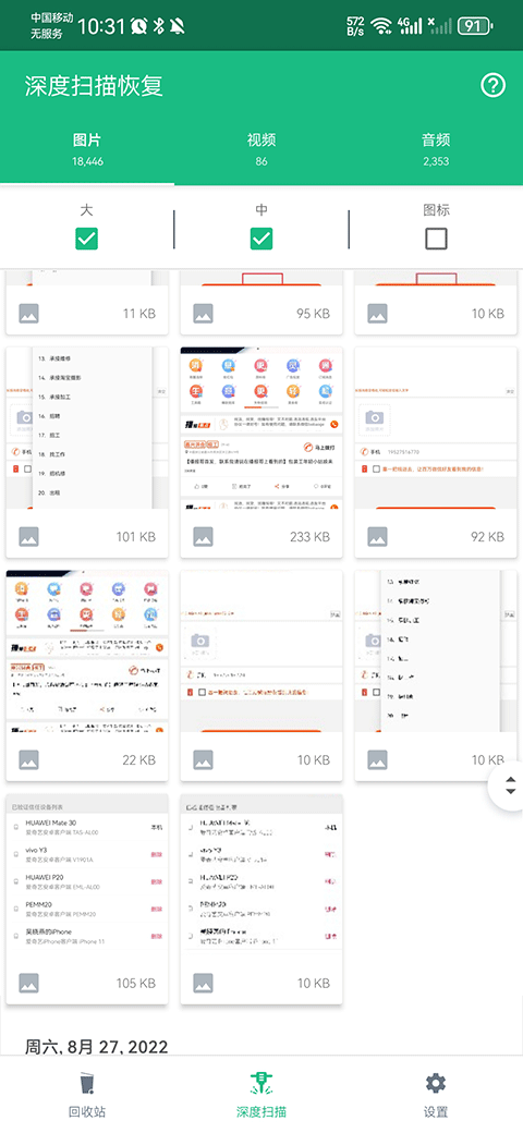 1、启动应用后,进入深度扫描界面,系统便会自动检测并列出设备中曾经删除的图片、视频以及音频文件。