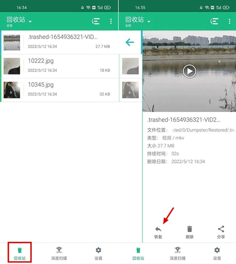 5、此外,安装Dumpster后,若通过该应用删除文件,可以在左下角的“回收站”中找到它们,并在此对已删除文件进行二次恢复管理。