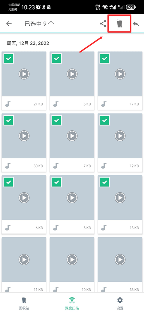 2、随后,逐一勾选所有需要删除的文件,确认无误后点击界面右上角的垃圾桶图标进行删除。